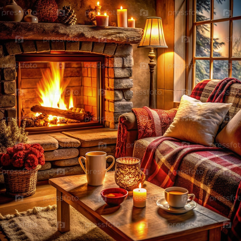 Уютная гостевая комната с камином и теплым освещением