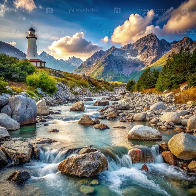Горная река течет мимо белого маяка на закате