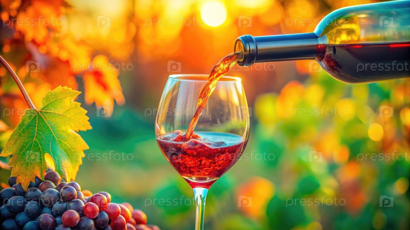 Красное вино налито в стакан на закате солнца на лозе