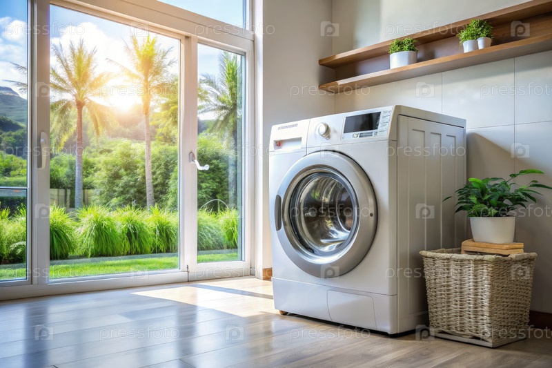 Белая стиральная машина в современной прачечной с солнечным видом