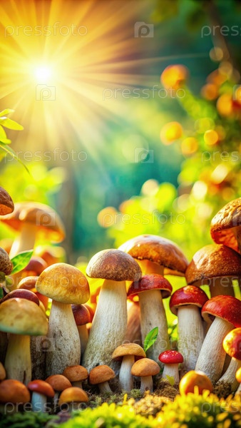 Группа красочных грибов, находящихся под солнечным светом на летном лесном полу