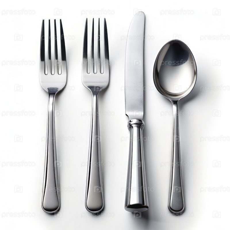 Набор элегантных ножей, вилок и ложки из нержавеющей стали на белом фоне для установки обеденного стола