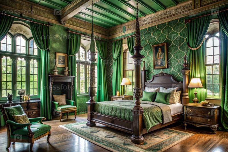 Роскошная зеленая спальня с четырьмя постелями и большими окнами