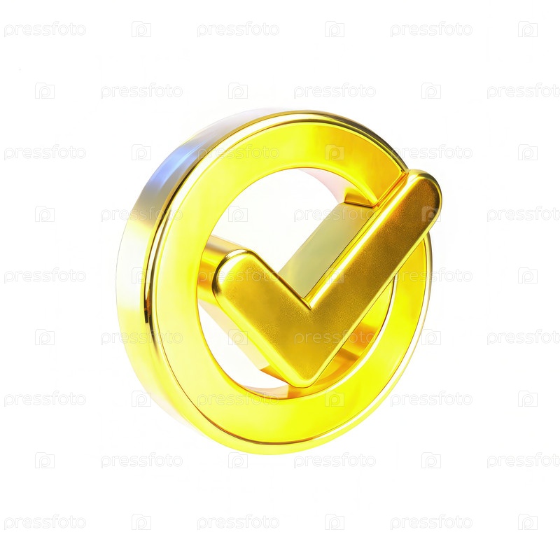 Блестящий золотистый иконный знак проверки, изолированный на белом фоне