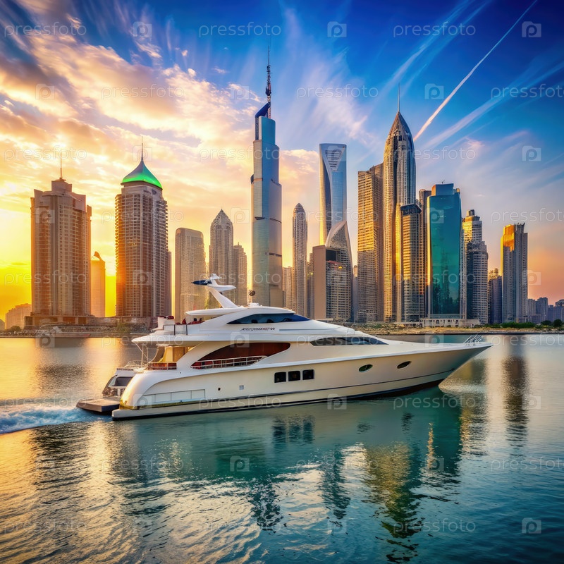 Роскошная яхта плывет по Дубайской марине на закате с небоскребами в фоне