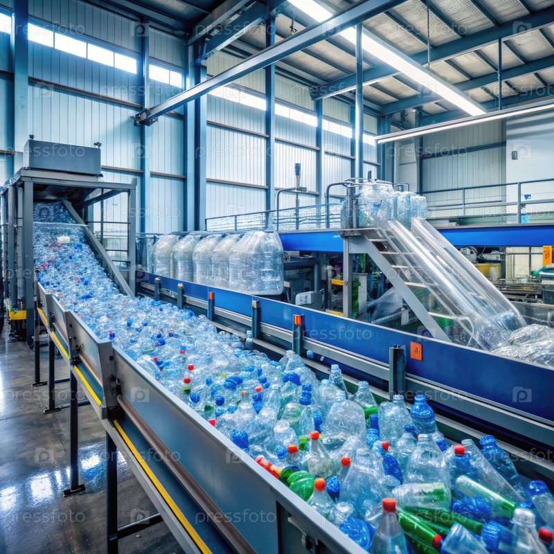 Прозрачный процесс переработки пластиковых бутылок на современном промышленном объекте. генеративный ИИ