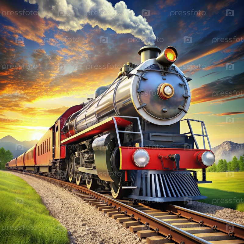 Старый паровоз путешествует по горному ландшафту на закате