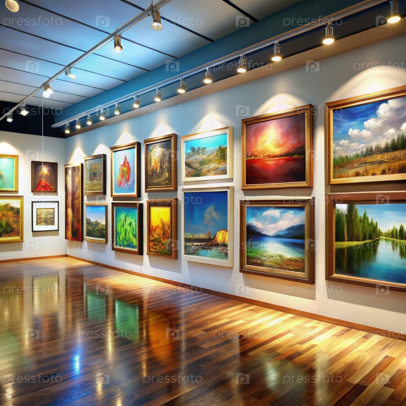 Галерея, выставляющая красочные пейзажные картины в центре внимания