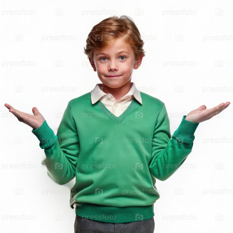 Молодой мальчик в зеленом свитере, демонстрирующий смущенное выражение лица во время жестикуляций руками