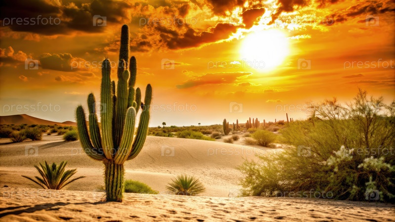 Высокий кактус держится высоко против палящего захода солнца в пустыне