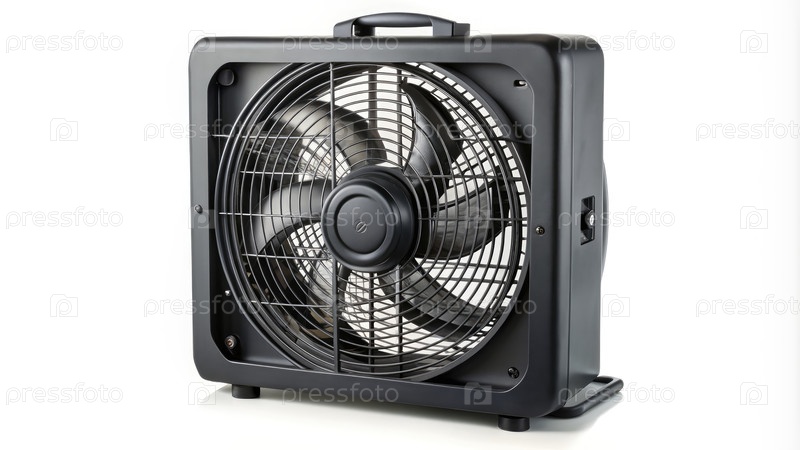 Черная коробка вентилятора с большими лезвиями на белом фоне