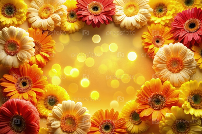 Круг ярко оранжевых и желтых герберных ромашек на золотом фоне