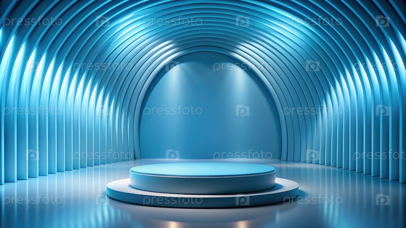 Элегантный синий подиум в современном пространстве с изогнутым освещением на месте мероприятия