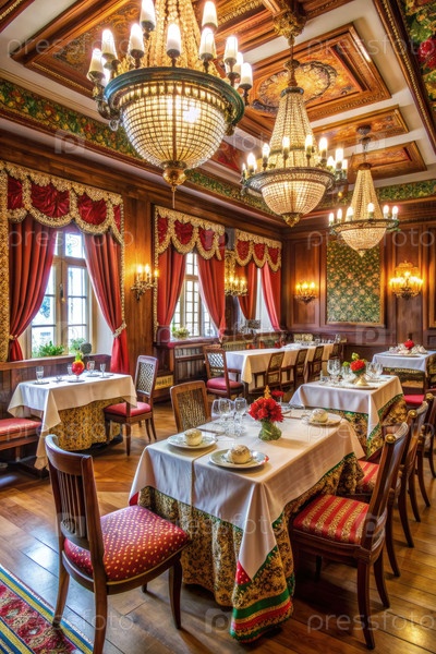 Элегантная столовая с кристаллическими люстрами и украшенным декором в русском ресторане