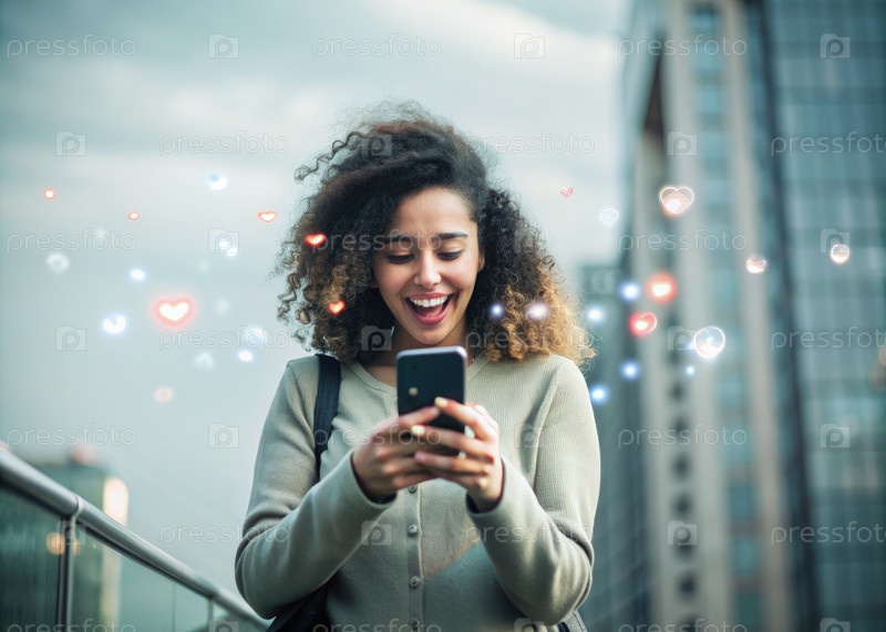 Веселый человек, испытывающий радость во время проверки телефонных уведомлений на улице в городской среде