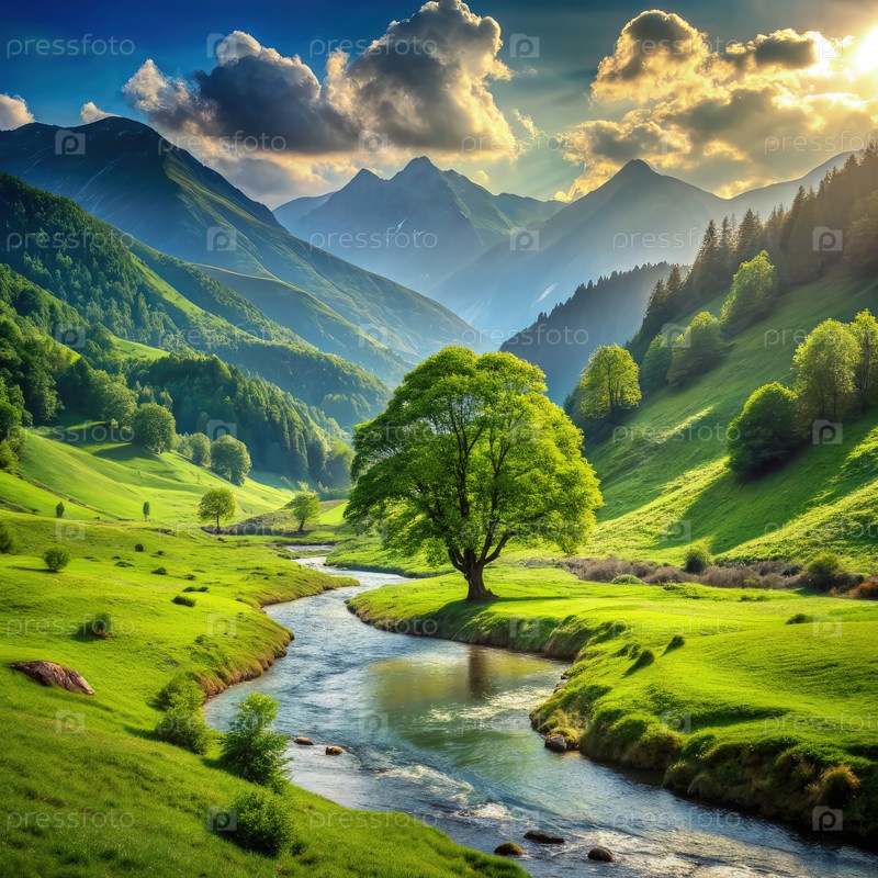Спокойная река, извивающаяся сквозь пышные зеленые холмы с горными вершинами на расстоянии