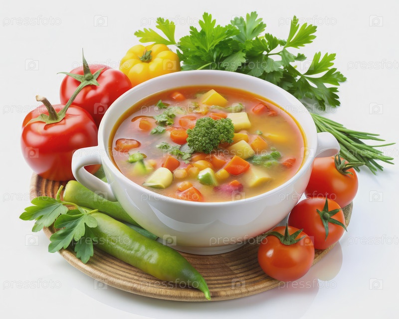 Чаша овощного супа со свежими помидорами, перцем и травами на белом фоне