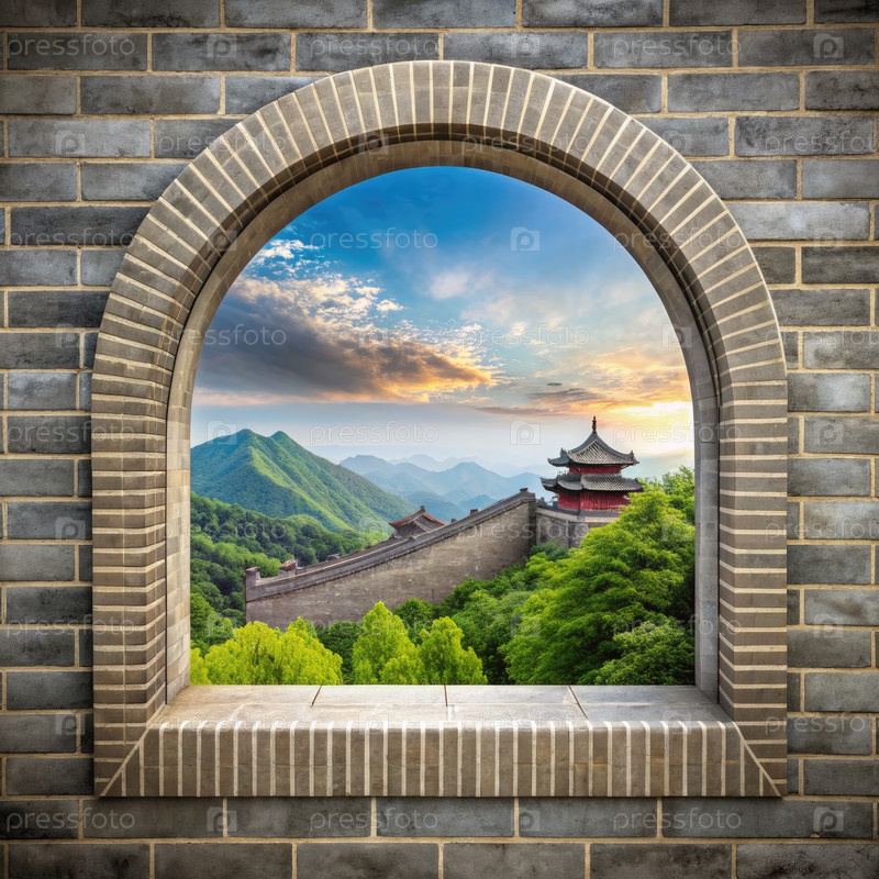 Вид из арочного окна на Великую китайскую стену при закате солнца