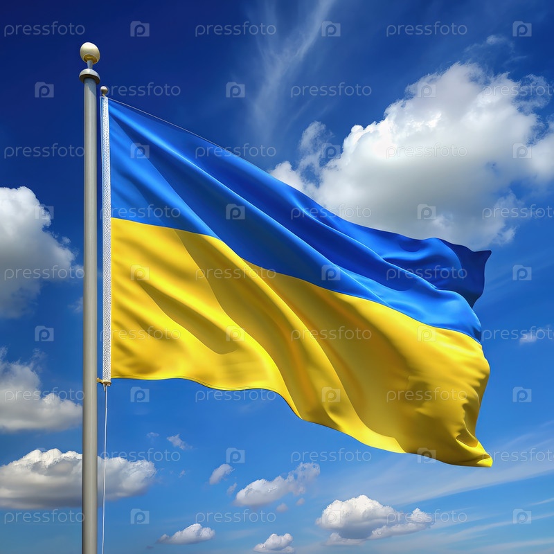 Украинский флаг, размахивающий ветром против голубого неба с белыми облаками