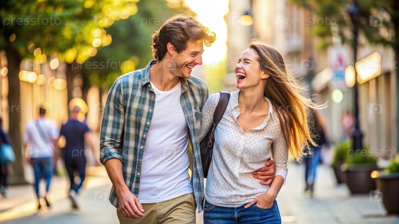 Молодая пара ходит и смеется вместе на солнечной городской улице