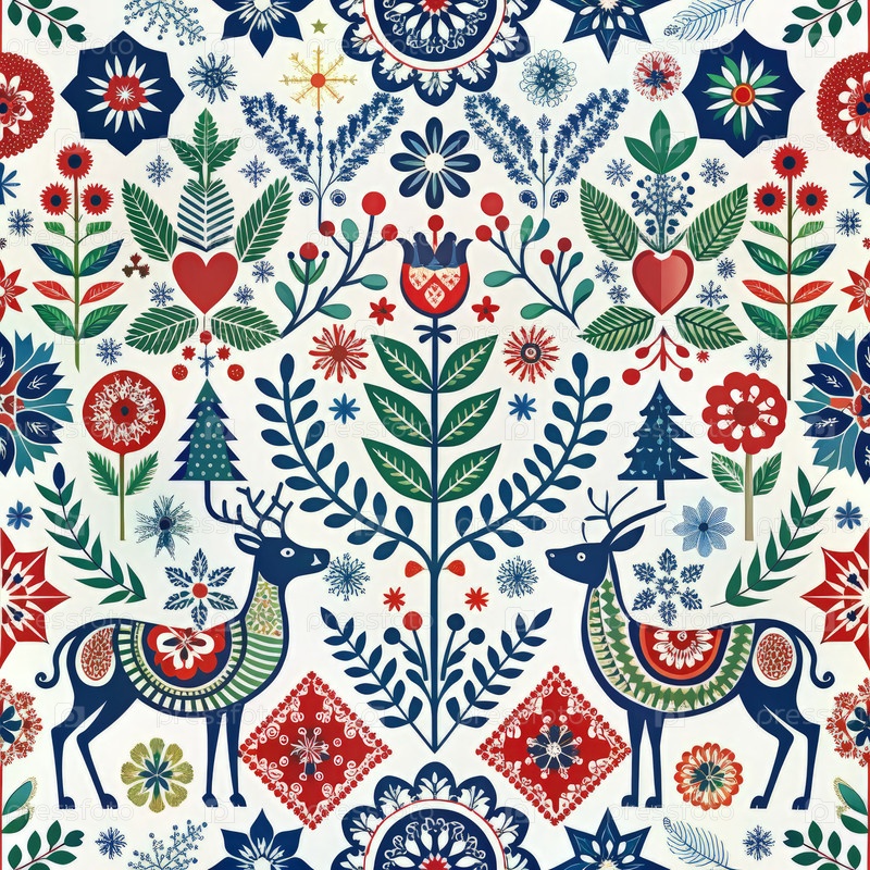Скандинавские народные узоры с красочными цветочными рисунками и оленями в праздничной обстановке