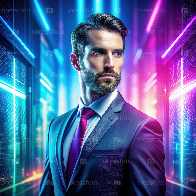 Элегантный бизнесмен уверенно позирует в футуристической обстановке с яркими цветами и мягким освещением