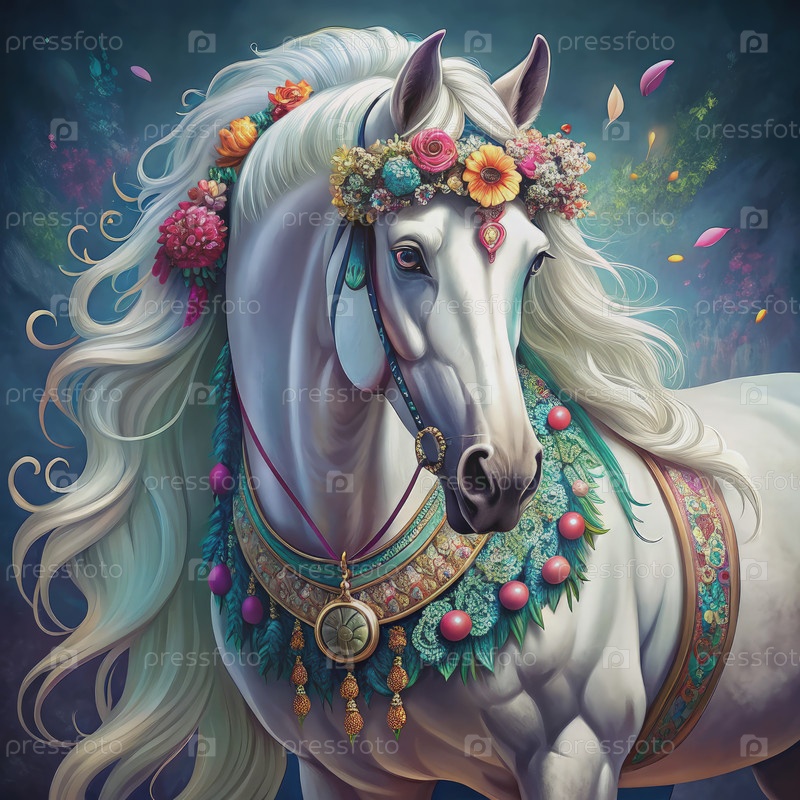 Белый фризский конь, украшенный цветами и драгоценностями