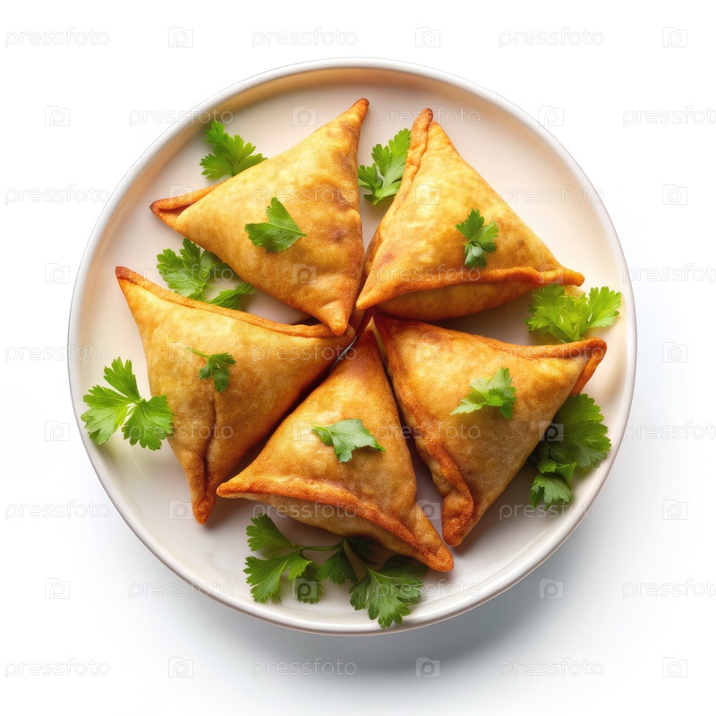 Хрустящие картофельные самозы на белой тарелке с фарфоровыми украшениями