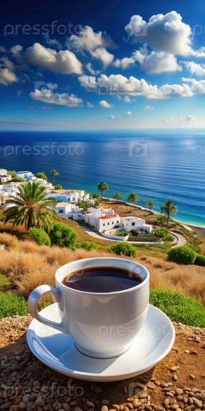 Чашка кофе с видом на береговую линию Средиземного моря