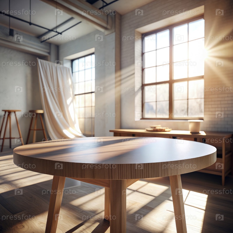 Солнечный свет освещает столярную мастерскую с помощью готового деревянного стола и естественного тепла