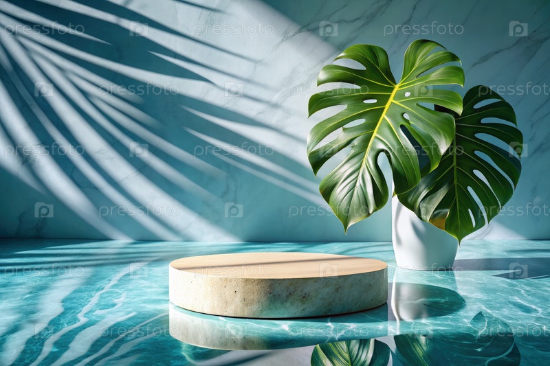 Элегантная летняя обстановка с мраморным подиумом и пышной зеленью. генеративный ИИ