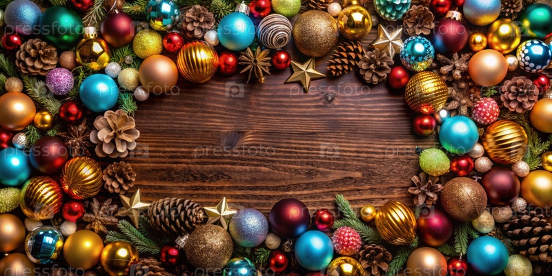 Праздничные рождественские украшения, граничащие с деревянной поверхностью