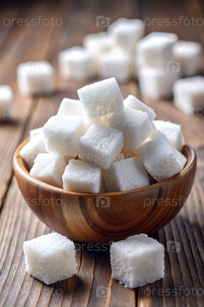 Белые кубики сахара тщательно расположены в деревянной посуде на кухонном столе