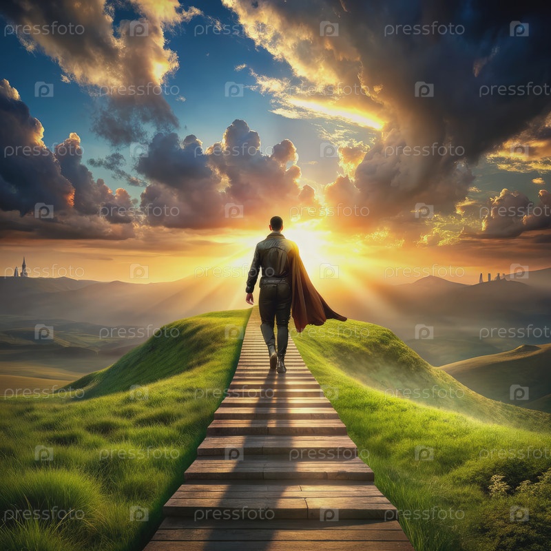 Человек, идущий к заходу солнца по лестнице в рай