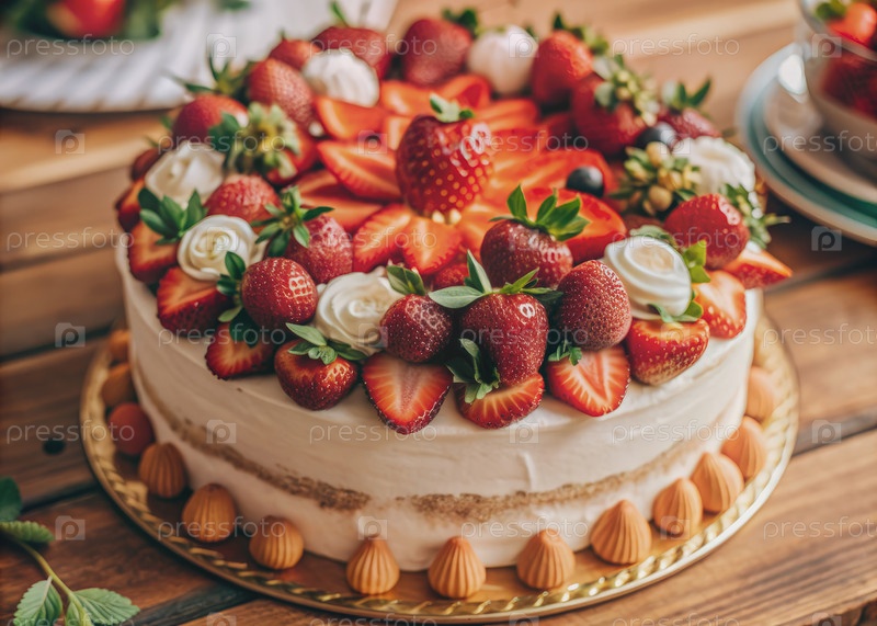Вкусный клубничный торт, украшенный кайфом и свежими фруктами
