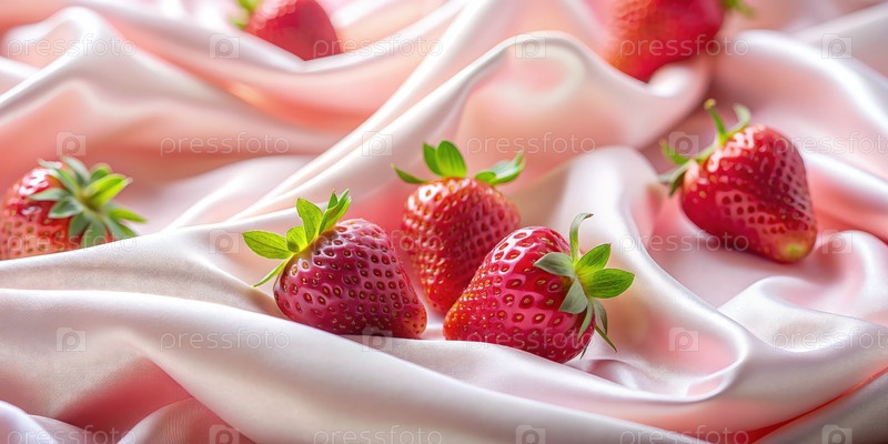 Зрелые клубники, отдыхающие на мягкой розовой шелковой ткани