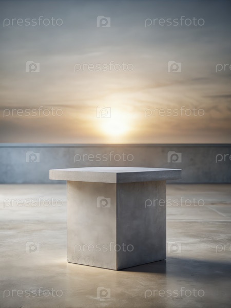 Бетонный подиум на небольшом рассвете против обширного горизонта с мягким светом восхода солнца