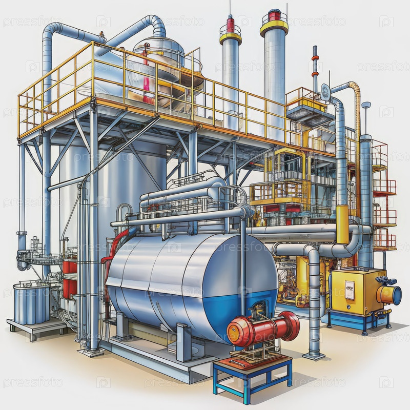 Иллюстрация крупномасштабного завода по обработке химических веществ с несколькими резервуарами и трубопроводами