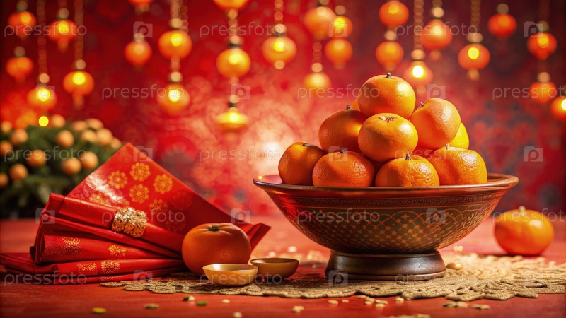 Праздничное празднование с красочной миской апельсинов, окруженной фонарями и украшениями