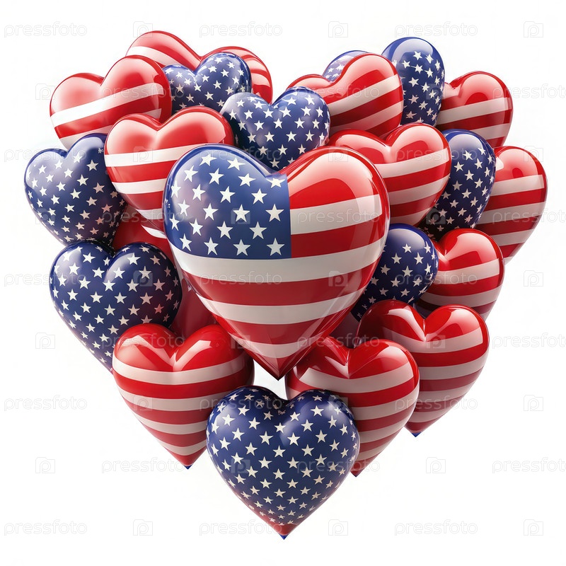 Красочные сердца, украшенные узорами американского флага, собираются в форме сердца для празднования национальных праздников