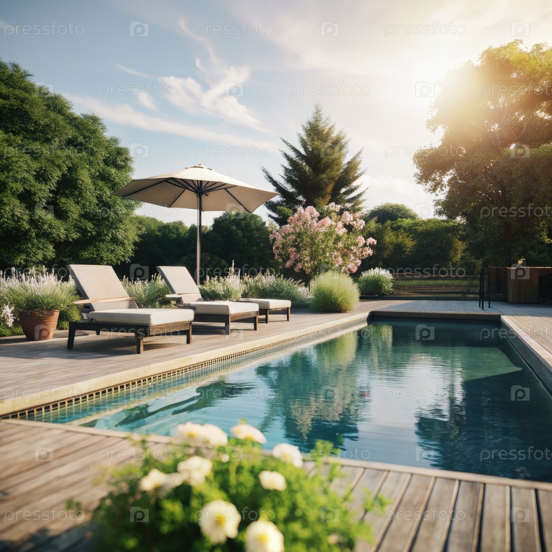 Расслабляющий летний день в красивом бассейне, окруженном пышной зеленью