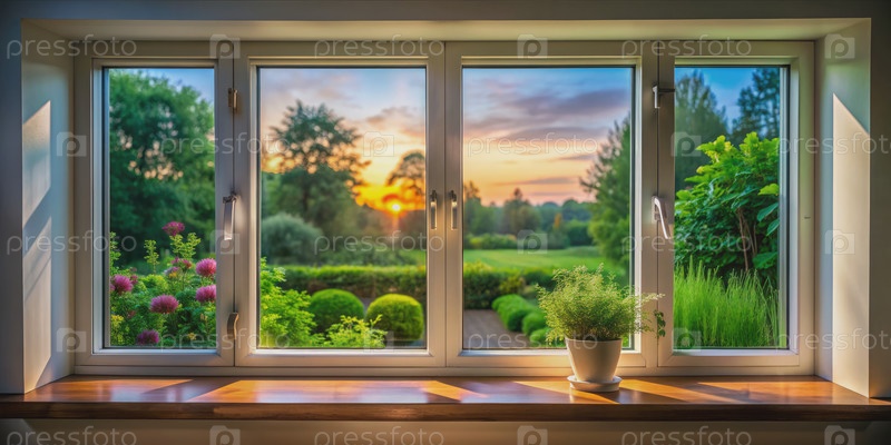Вид на закат солнца над зеленым полем с деревьями и цветами