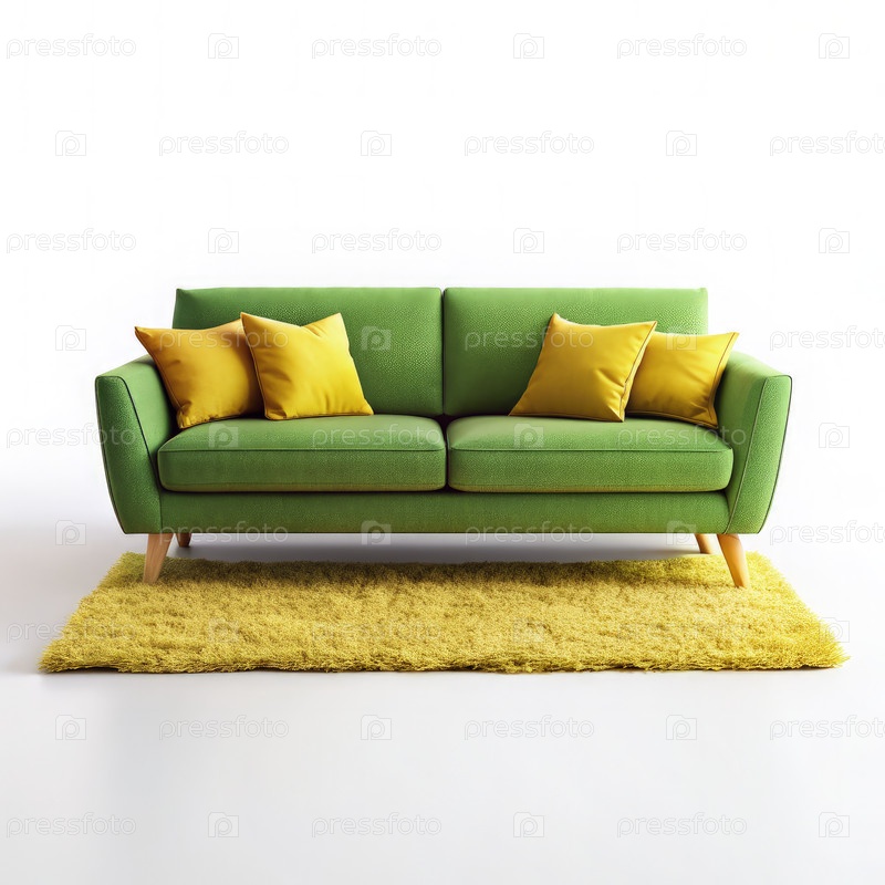 Вибрирующий зеленый диван с желтыми подушками на мягком ковре в яркой комнате
