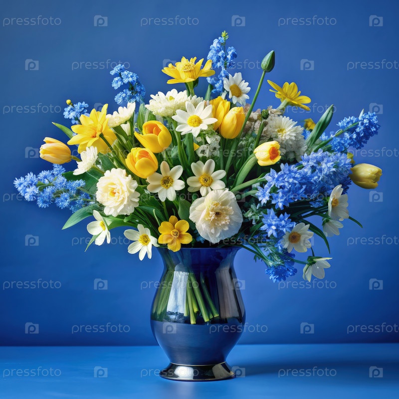 Очаровательный букет красочных весенних цветов в синей вазе на ярком фоне