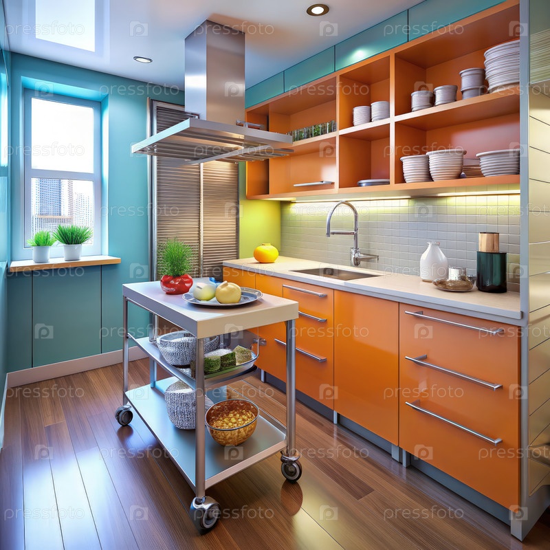 Кухонная коробка с оранжевыми шкафами и корзиной из нержавеющей стали