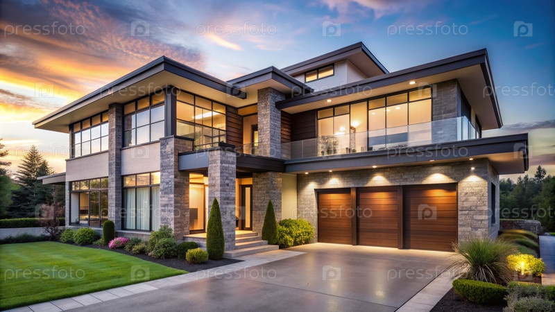 Дом с каменным фасадом и обширными окнами на рассвете