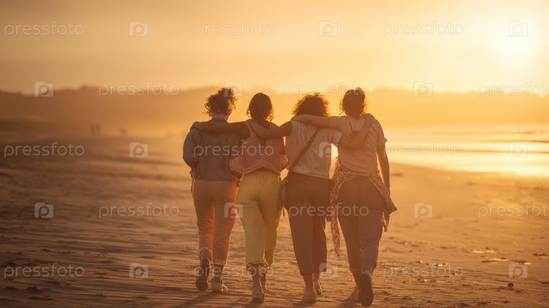 Друзья, гуляющие вдоль пляжа при закате солнца, теплый золотой свет, береговая линия океана, беззаботные летние путешествия, сильные узы дружбы и расслабленный момент образа жизни