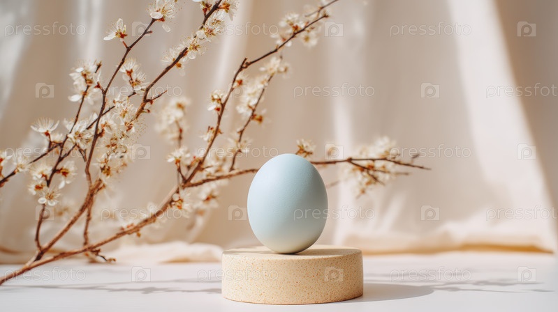 Минимальная пасхальная композиция с пастельными яйцами и ветвями цветов, создавая мягкий весенний декор, чистый фон макета и элегантную эстетику сезонного дизайна