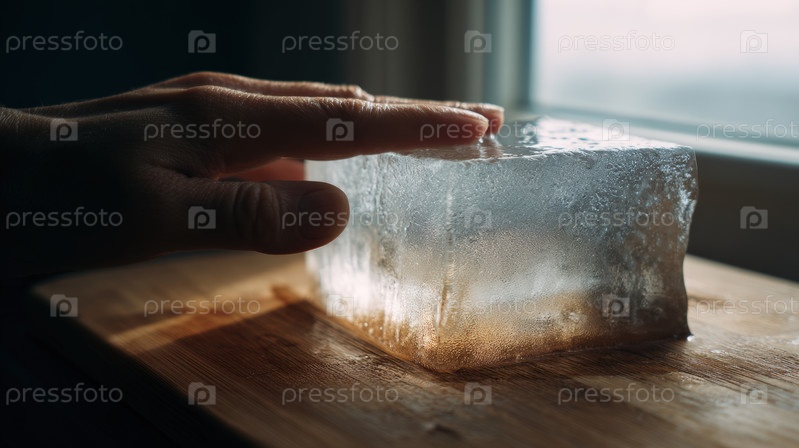 Таяние кубиков льда на деревянном столе с конденсацией и солнечным светом, захват температурного контраста, концепция изменения климата, естественная текстура и подробности трансформации воды