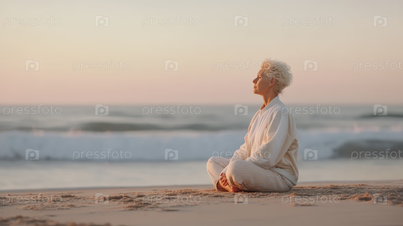 Женщина медитирует на пляже при закате солнца, мирная океанская сцена выражает расслабление, осознанность, образ жизни путешественников и эмоциональное равновесие